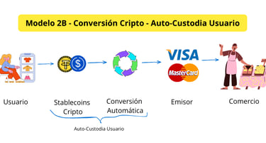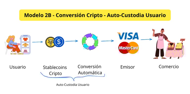 Aquí el usuario mantiene saldo en stablecoins dentro de la plataforma. Cuando realiza un pago, el sistema convierte automáticamente ese cripto a moneda fiat.