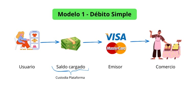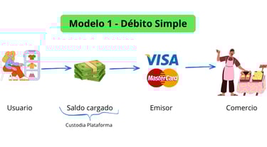 No existe crédito ni colateral. El flujo es directo: saldo → emisor → comercio.